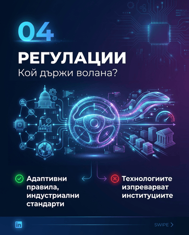 Как регулираш нещо, което е по-умно от теб? Това е фундаменталният проблем. Правителствата са десетилетия назад в разбирането на технологията. Пазарът е показал, че не може да се саморегулира – виждали сме го с социалните медии, с дезинформацията, с addiction by design. Международните органи? Хубава идея на хартия, невъзможна на практика заради геополитическо съперничество. Истината е, че нуждаем се от етични рамки, вградени в самите AI системи, не от външни регулации. Това означава: transparency в алгоритмите, human oversight при критични решения, accountability когато нещо се обърка. Но кой налага това? Трябва multi-stakeholder подход – правителства, корпорации, граждански организации, технически експерти работещи заедно. Проблемът е, че технологията се развива с експоненциална скорост, а регулацията – с линейна. До момента, когато законът е готов, AI е вече 5 поколения напред. Единственото решение е проактивна етика от дизайна, но корпорациите не го правят заради конкурентен натиск. Попаднали сме в капан без изход.