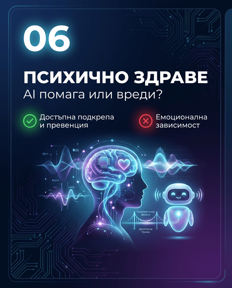 Рискът е емоционална зависимост и ерозия на човешките връзки. Проучванията са ясни: AI компаньоните краткосрочно намаляват самотата, но дългосрочно я задълбочават. Защо? Защото AI е винаги достъпен, винаги съгласен, а реалният човек не е. Това прави истинските връзки разочароващи по сравнение. Резултат: оттегляне в AI симулации. До 2030 рискуваме поколение, неспособно на емоционална устойчивост, защото AI „терапевтите" не могат да учат човешка взаимност – те са едностранни огледала. Психичното здраве не е технически проблем – то изисква човешко присъствие, грешки, конфликти, помирения. AI може да скрие депресията, но не и да я излекува. Нуждаем се от строги граници – AI като инструмент за скрининг, но не като заместител на терапевта.