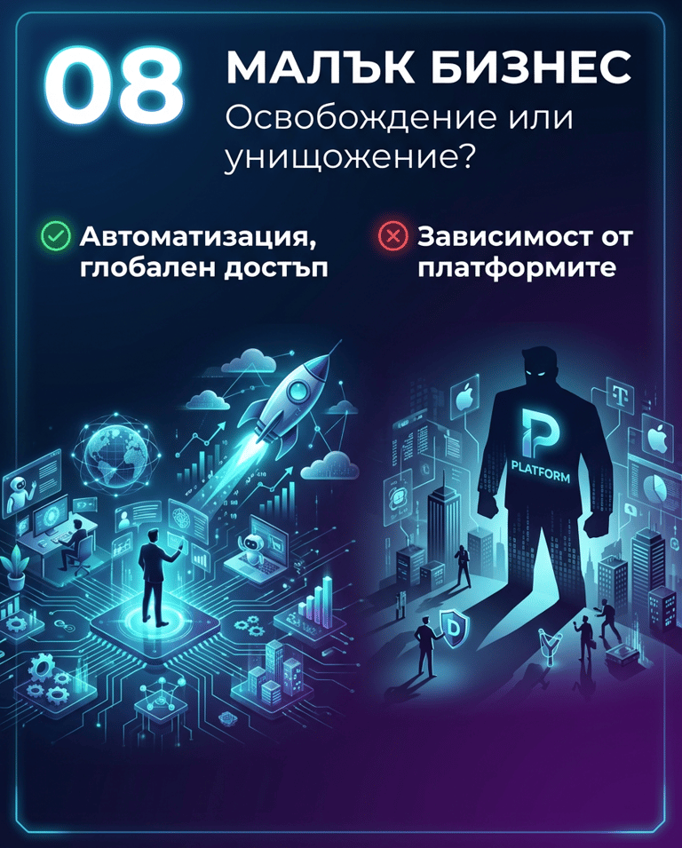 AI ще елиминира повечето малки бизнеси до 2027. Защо? Защото автоматизацията е по-бърза от адаптацията. Днес AI може да замени 90% от услугите, които един малък бизнес предлага – дизайн, маркетинг, счетоводство, клиентска поддръжка и т.н. Платформите като Amazon, Alibaba вече интегрират AI – те ще предложат всичко по-евтино и по-бързо от малкия бизнес. До 2030 само елитните изпълнители, които използват AI за 10-100x продуктивност, ще оцелеят. Но автоматизацията ги настига. Идеята, че всеки може да изгради $1 млрд. компания, е глупост – защото всеки означава никой. Ако всички имат AI, никой няма предимство. Резултат: масово фалиране на малки бизнеси, концентрация в платформите, загуба на автономия. Съветът ми: научете AI бързо, намерете ниша, която машините не могат да автоматизират (човешка връзка, творчество, етика). Или станете част от платформата, или изчезнете.