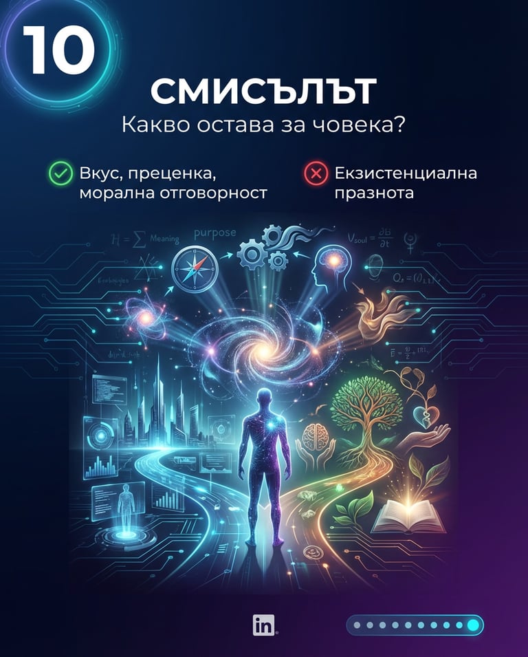 До 2030 човечеството ще се изправи пред философски въпрос, който се е избягвал хилядолетия: Какво означава да си човек, когато „работата" вече не е отговор? Този въпрос е едновременно най-страшният и най-освобождаващият в човешката история. Отговорът, който ще дадем между 2025 и 2030, ще определи столетията след това.